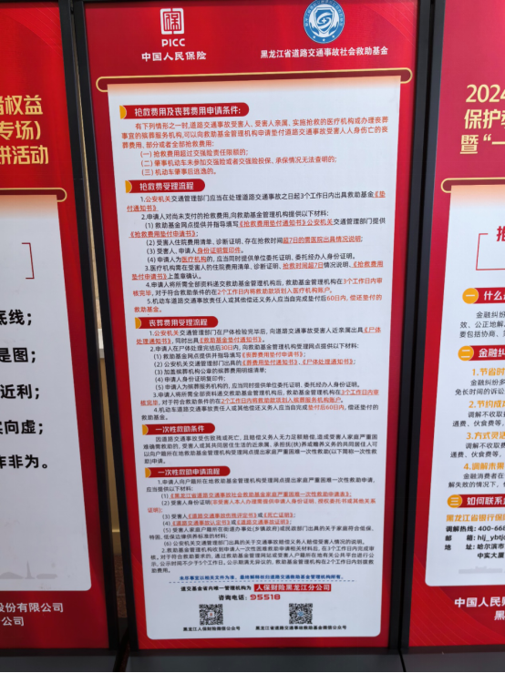 “人民保险 服务人民”是人保财险黑龙江分公司始终坚持的初心和使命,作为全省道路交通事故社会救助基金唯一受托管理机构,公司充分发挥公司网络、机构、人才、技术等方面的优势,向社会提供专业、规范、便捷的救助基金垫付服务,保障道路交通事故受害人依法及时得到社会救助,为社会弱势群体开启生命“绿色通道”。活动现场向广大群众讲解了道路交通事故社会救助基金申请条件、受理流程等事宜,并发放宣传折页。